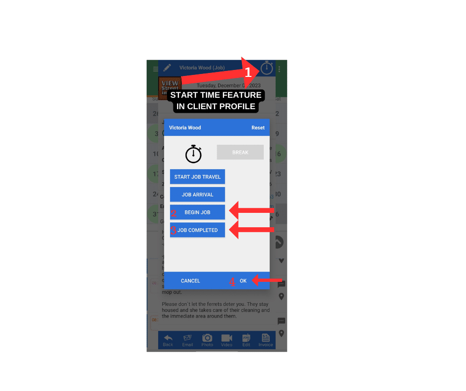 - Click “Begin Job” clock-in/out feature in client profile